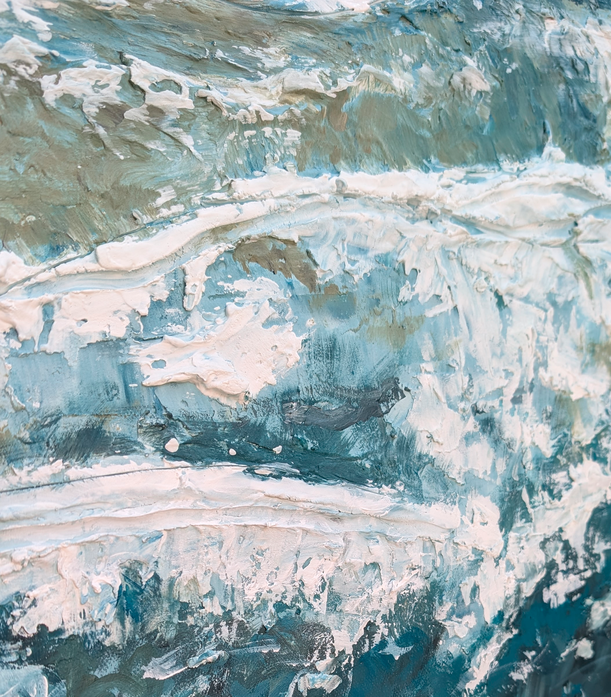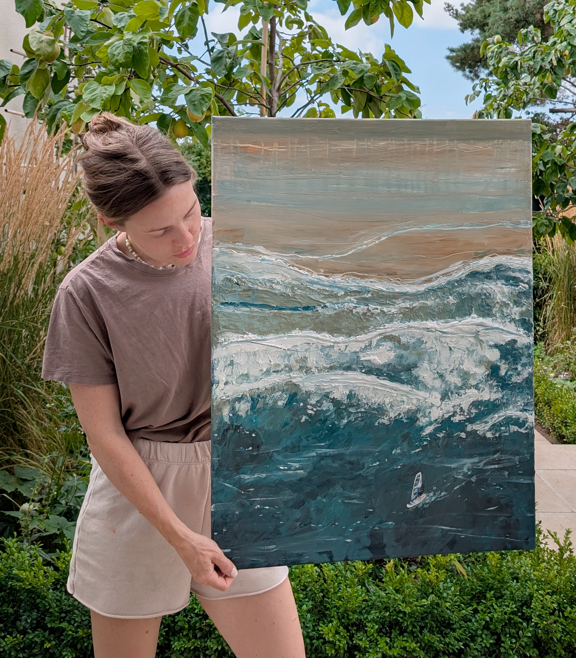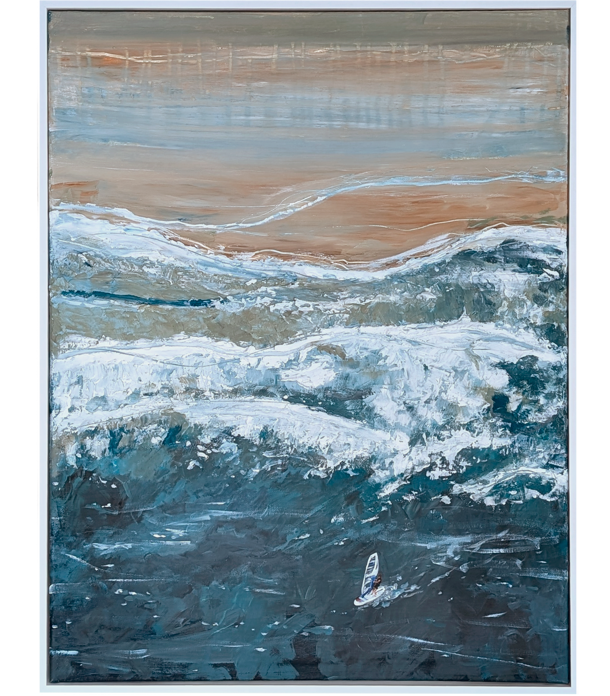 This piece is highly textured and expressive, especially the waves, which convey movement and energy, drama and depth. It captures nature’s power by highlighting the smallness of the windsurfer enjoying the thrill of the tempestuous ocean. A metaphor for life - feel the fear and do it anyway!